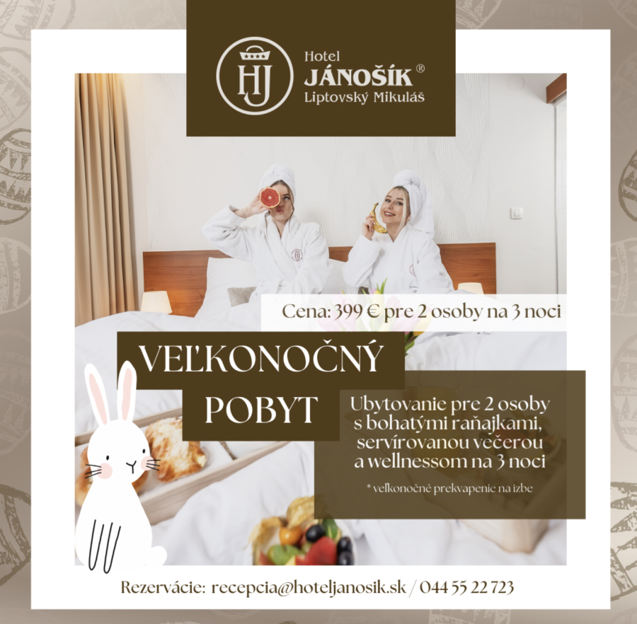 Doprajte si oddych počas Veľkej noci v Hoteli Jánošík v Liptovskom Mikuláši, kde na vás čaká pohodlné ubytovanie, chutná gastronómia a relax vo wellness. Užite si sviatočné chvíle s rodinou či partnerom a objavte krásy Liptova, ktorý ponúka množstvo možností na oddych aj aktívny program.